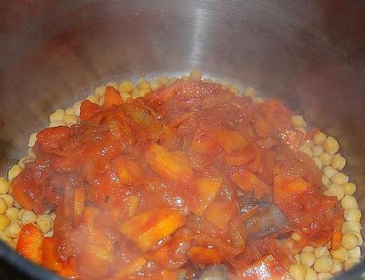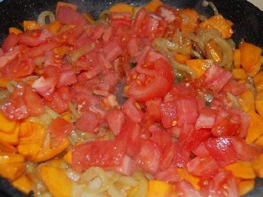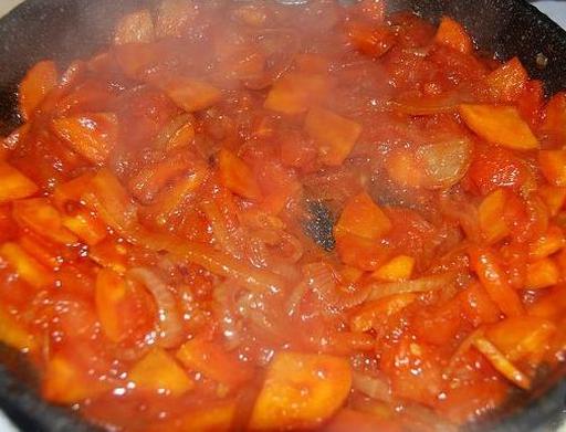 Add the carrot to the onion and sauté until soft. Then, add the tomatoes and cook until they soften. Reduce the heat, cover, and let the vegetable mixture simmer for 15-20 minutes.