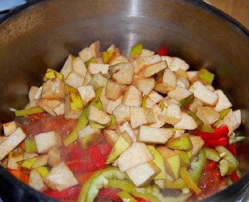 Next, add the sliced bell pepper and quince to the pot.