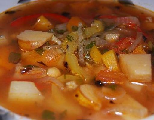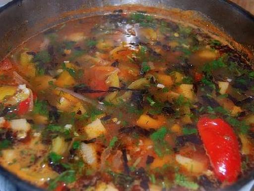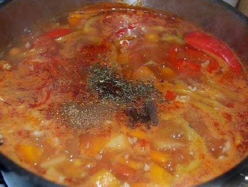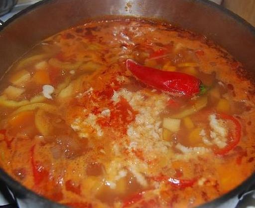 Pour the strained broth over the ingredients. Bring to a boil and simmer for 30 minutes. Then add diced potatoes and cook for another 10 minutes. Add a whole hot pepper and crushed garlic.
