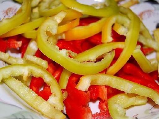 Remove the seeds from the bell pepper and slice it into rings or half-rings.