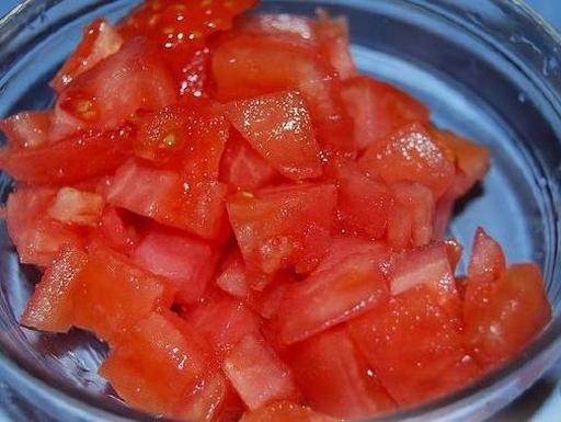 Blanch the tomatoes in boiling water, peel the skin, and dice the pulp.