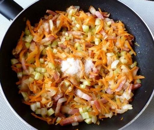 Add the celery and carrot to the pan with the brisket and onion, sprinkle in sugar. If necessary, add a little vegetable oil. Simmer the brisket with vegetables for 3 minutes.