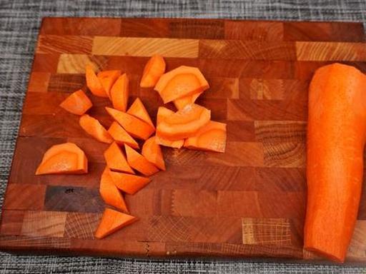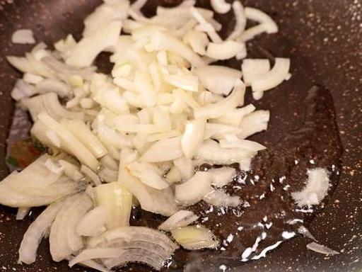 Peel the onion, slice it into quarter-rings, and place it in a preheated frying pan with vegetable oil. Sauté, stirring, for 3-4 minutes.