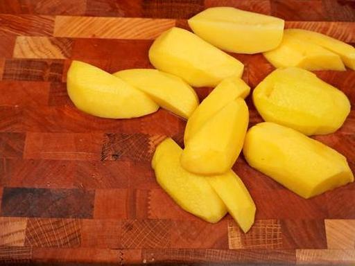 Peel the potatoes. Leave small potatoes whole; cut larger potatoes into pieces.