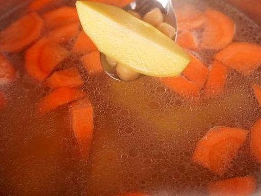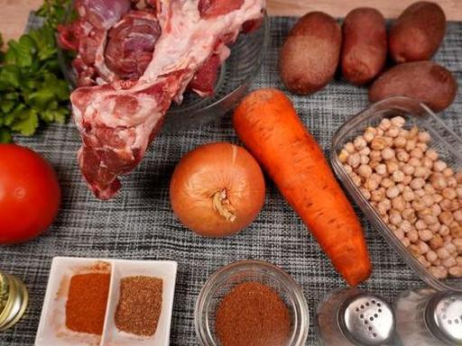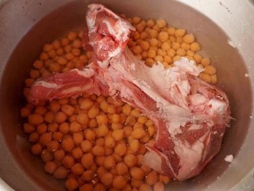Separate the lamb meat from the bone. Place the bone and chickpeas in a large pot (kazan) and pour in 1.5 liters of water. Begin heating.