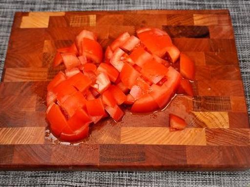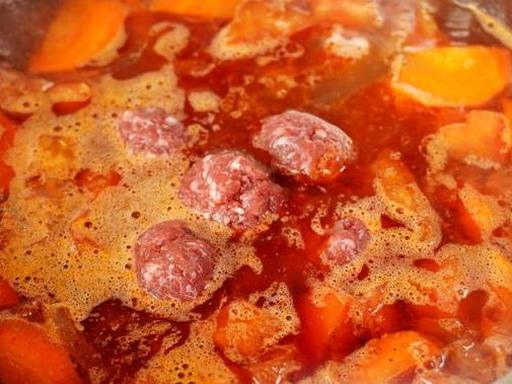 Add the tomato-onion sauté. After the meatballs float to the surface, cook the soup for 10 minutes. Then remove from heat.