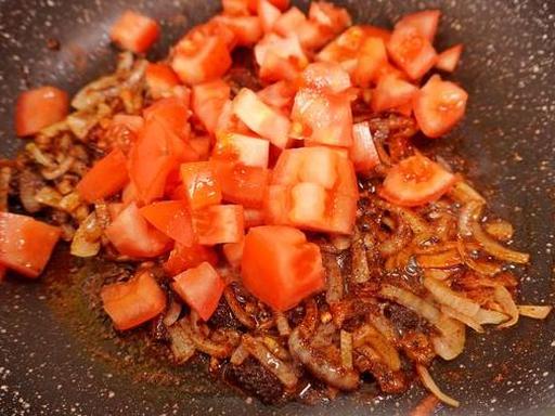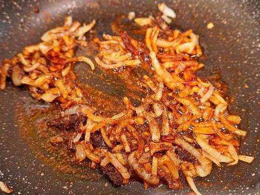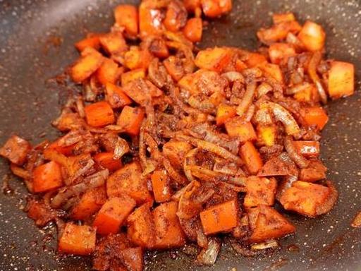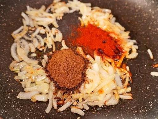 To the sautéed onion, add baharat seasoning and ground red pepper.