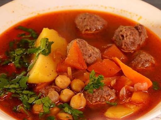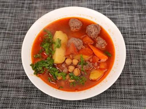 Küfta Shurpa is a Turkish soup featuring meat dumplings (küfta), vegetables, and chickpeas. The chickpeas are first soaked, then cooked with a lamb bone. Potatoes and sautéed vegetables are added to the broth. Small meatballs are prepared from beef and lamb and incorporated into the soup during the final stages of cooking. Eastern spices and herbs lend the shurpa an exceptionally aromatic quality.