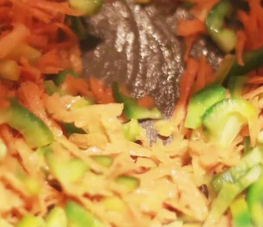 Heat vegetable oil in a pan. Add the carrot and bell pepper, sauté for 5 minutes, stirring.