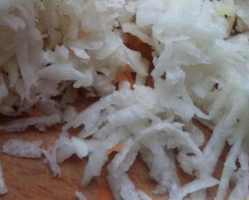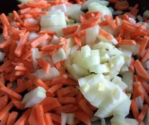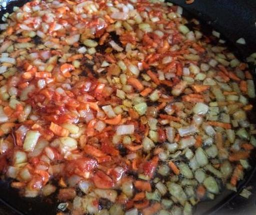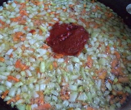 Heat a frying pan with vegetable oil. Add the prepared onion, celery, and carrot to the hot oil. Sauté the vegetables over medium heat, stirring, for 2-3 minutes. Add tomato paste or fresh grated tomatoes.