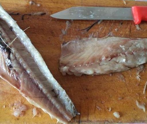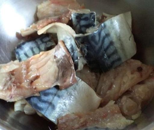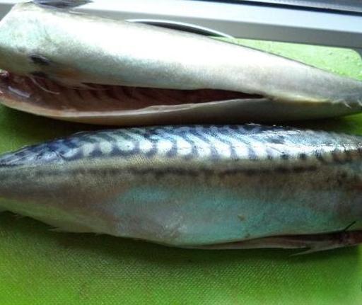 Defrost the mackerel, cut off the head, slice open the belly, and eviscerate. Rinse the fish thoroughly with cold water.