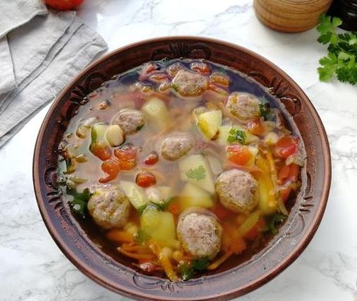 This aromatic and hearty soup with meatballs, canned beans, and a vegetable sauté is quick and easy to prepare. Meatballs made from pork and beef mince, combined with beans, make the dish nutritious, while the sautéed vegetables add a vibrant flavor.