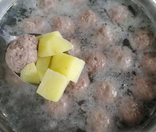 Once the water in the pot boils, add the meatballs and diced potatoes. Cook for 15 minutes.