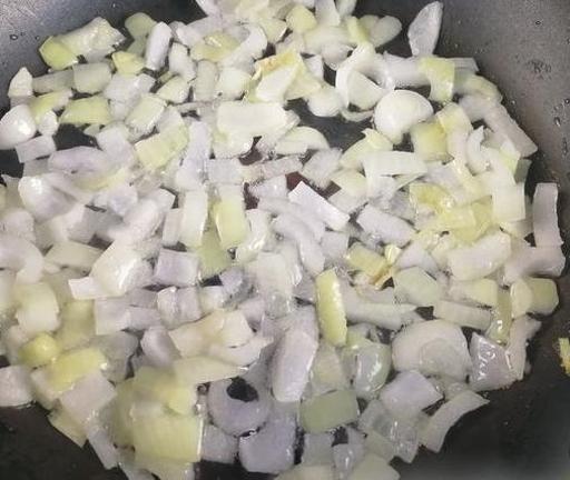 Meanwhile, finely chop the onion. Heat vegetable oil in a frying pan and sauté the onion for about 3 minutes.