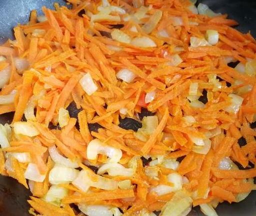 Grate the carrots on a coarse grater. Add the grated carrots to the onion in the pan and sauté for another 3 minutes.