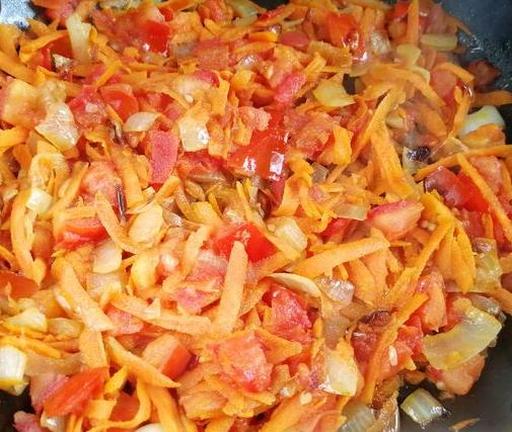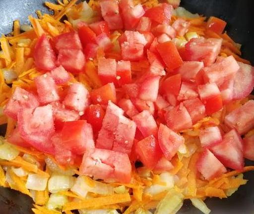 Cut the tomatoes into medium cubes and add them to the vegetables in the pan. Simmer over low heat for 5 minutes.