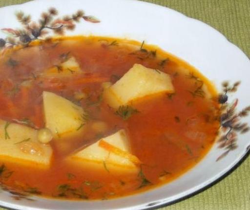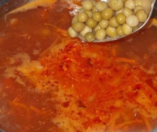 Transfer the vegetable sauté to the pot with the potatoes. Add the canned green peas along with the liquid from the can and cook the soup for another 5 minutes.