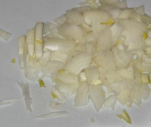 While the potatoes are cooking, prepare the other vegetables. Peel and finely chop the onion.