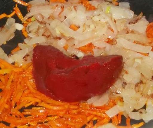 Combine the sautéed onion and carrot, add the tomato paste, stir, and cook together for another 1-2 minutes.