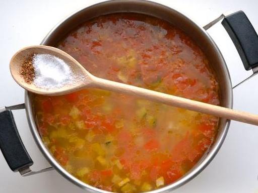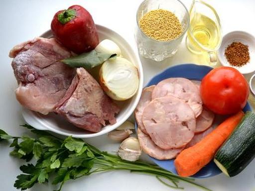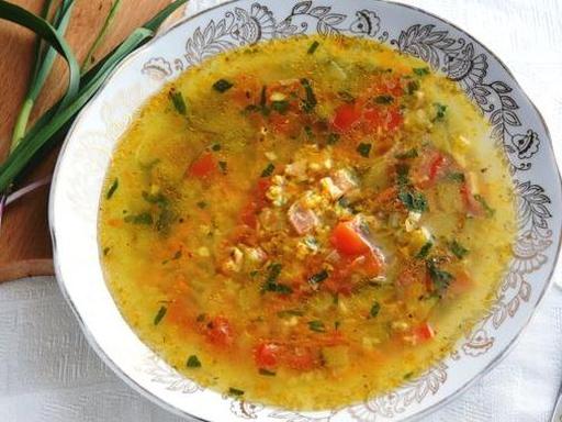 The soup with millet, ham, zucchini, and bell pepper is ready.