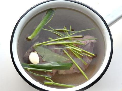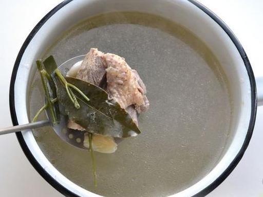 Remove the chicken meat and parsley stems from the cooked broth. The chicken meat is not used in this recipe (it can be used for another dish). Strain the broth.