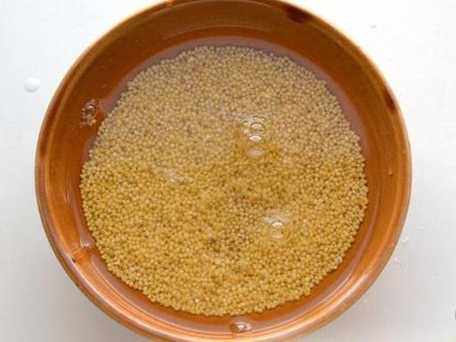 Rinse the millet several times until the water runs clear. Then pour boiling water over it for about 3 minutes. After that, drain the millet in a fine-mesh colander and rinse under running water.