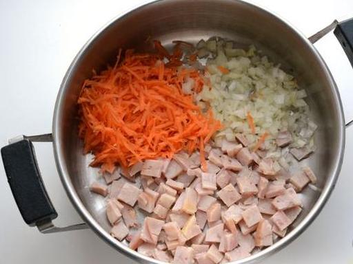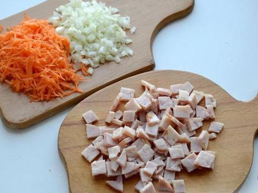 Peel the onion and cut it into small cubes. Peel the carrots and grate them coarsely. Cut the ham into small cubes.
