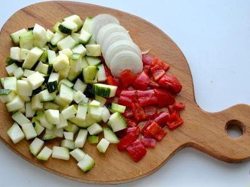 Core and deseed the bell pepper. Dice the zucchini (or courgette) and bell pepper into small cubes. Slice the leek into thin rings.