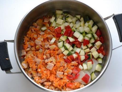 Add the zucchini, bell pepper, and leek to the pot with the other ingredients. Sauté, stirring, over medium heat for about 3-4 minutes.
