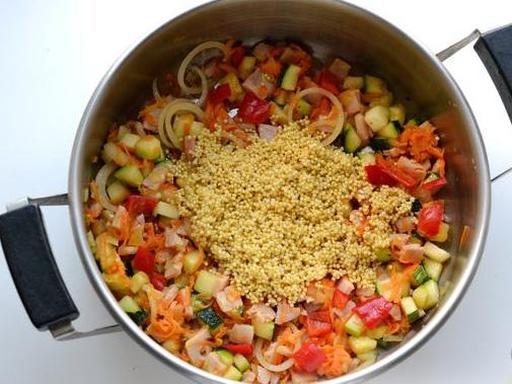 Pour the strained broth into the pot with vegetables and millet, bring to a boil, and cook until the millet is tender, approximately 15-20 minutes.