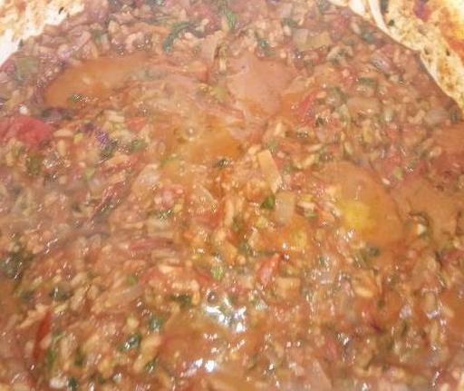 Смешайте измельчённые помидоры, обжаренный лук и сливовое пюре. Варите на медленном огне 40 минут. По истечении указанного времени добавьте соль, сахар, перец горошком, лавровый лист и рис (если используете). Ещё через 20 минут добавьте чеснок, пропущенный через пресс, измельчённую зелень и орехи (если используете). Проварите заготовку "Харчо" ещё 15 минут, затем добавьте уксус.