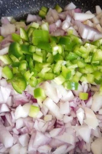 Лук и перец чили нарежьте, затем выложите на сковороду с растительным маслом.