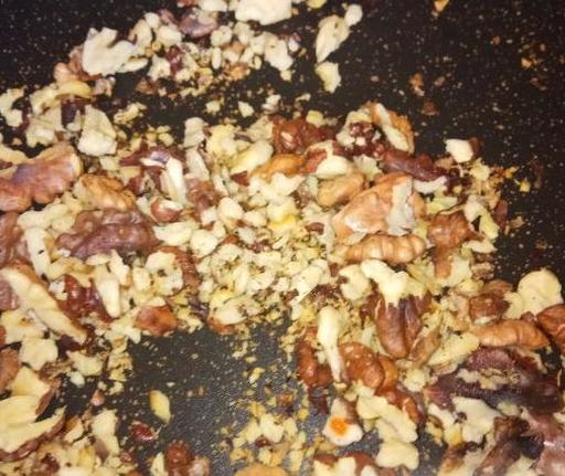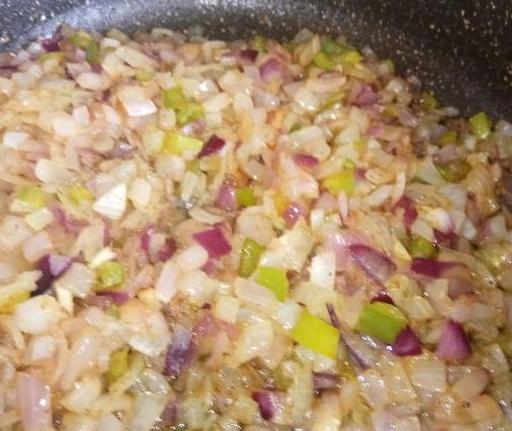 Посыпьте лук с перцем чили хмели-сунели и обжаривайте до золотистого цвета.