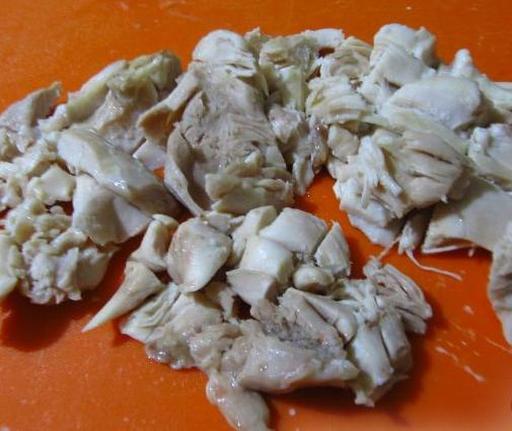 Остывшее куриное мясо нарежьте небольшими кусочками.
