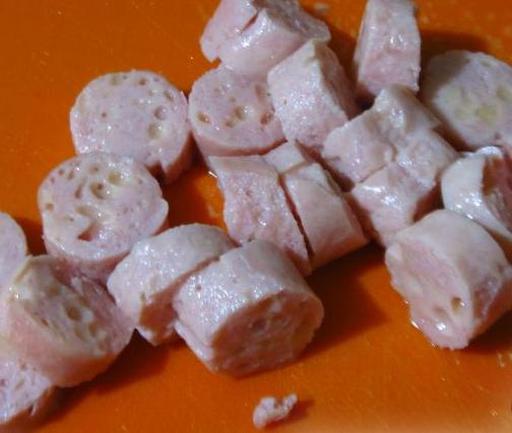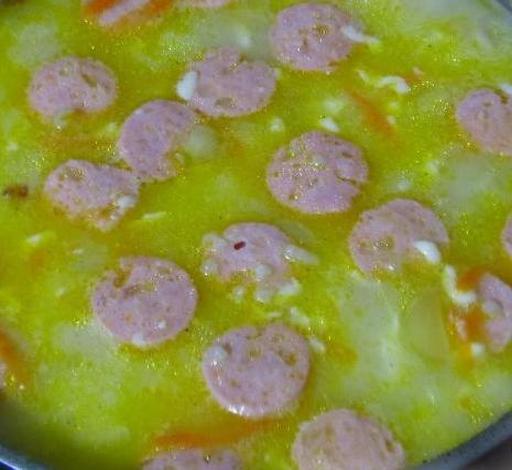 Добавьте в суп нарезанное куриное мясо, обжаренный лук с морковью, нарезанные сосиски и тертый сыр. Готовьте еще 5 минут, до размягчения картофеля. Подавайте суп, посыпав свежей зеленью.