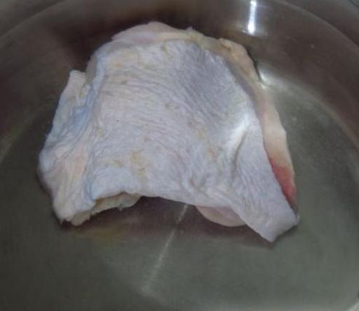 Поместите куриное бедрышко в двухлитровую кастрюлю, залейте водой доверху. Доведите до кипения и варите до готовности в течение 15 минут.