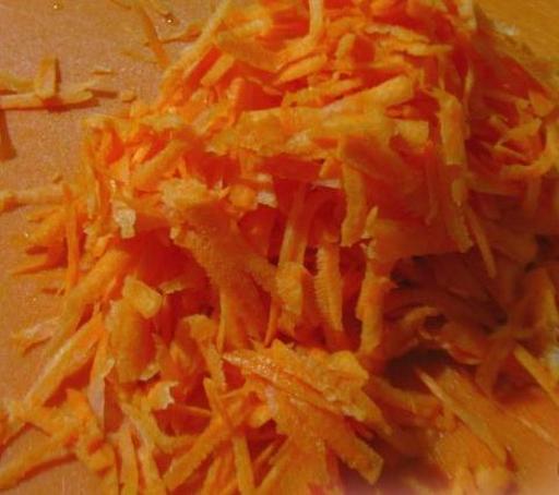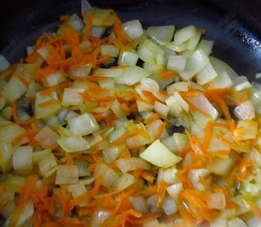 Обжарьте нарезанный лук и натертую морковь на растительном масле до золотистого цвета.