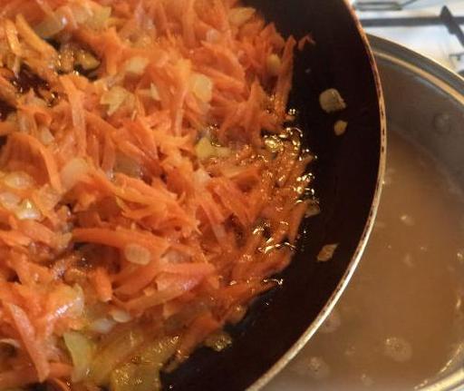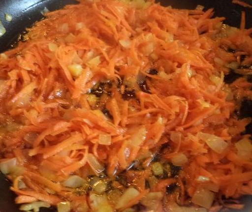 Разогрейте сковороду с растительным маслом. Обжарьте на ней лук и морковь на среднем огне, помешивая, в течение 2-3 минут до мягкости.
