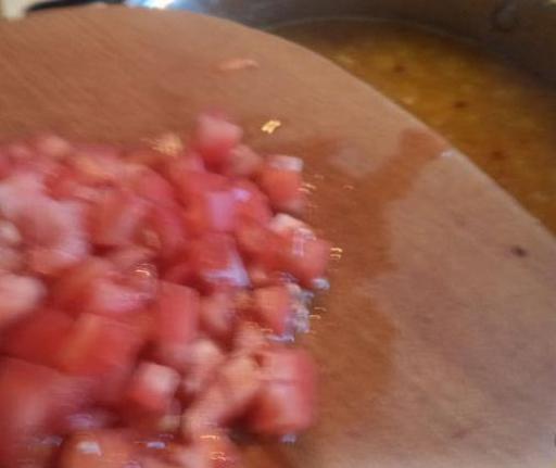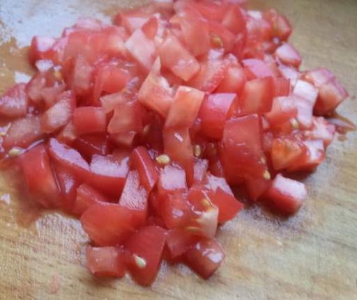 Помидор вымойте, бланшируйте кипятком, снимите кожицу и нарежьте мелкими кусочками.