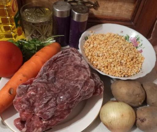 Подготовьте необходимые продукты для горохового супа с говядиной.