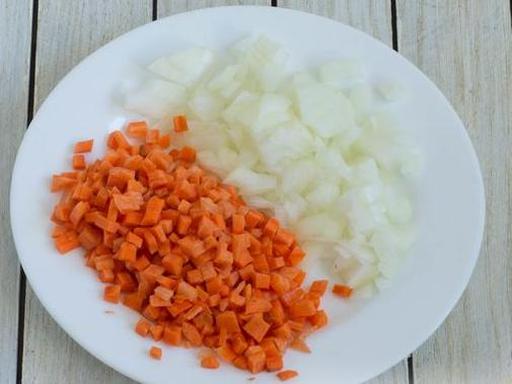 Очистите лук и нарежьте его мелкими кубиками. Очищенную морковь нарежьте небольшими кубиками.