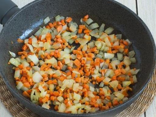 В сковороде разогрейте растительное масло. Выложите нарезанные лук и морковь, обжаривайте на среднем огне, помешивая, в течение 2-3 минут до мягкости.