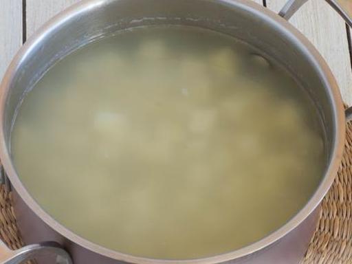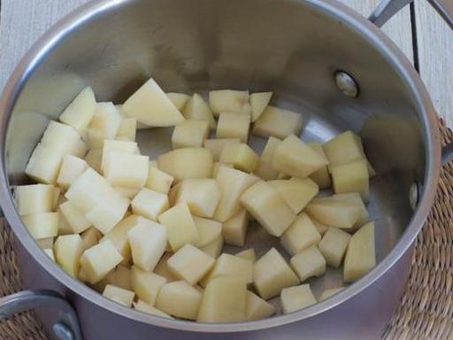 Очистите картофель и нарежьте его небольшими кусочками. Выложите нарезанный картофель в кастрюлю, предназначенную для супа.