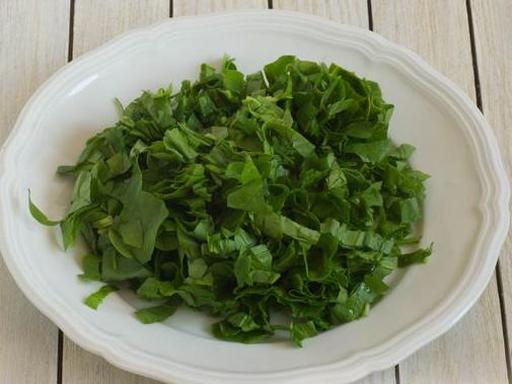 Тщательно промойте шпинат в большом количестве воды, чтобы удалить частички грунта. Переложите чистый шпинат в дуршлаг. После того как стечет вся лишняя вода, нарежьте шпинат небольшими кусочками. Если стебли жесткие, их рекомендуется срезать.