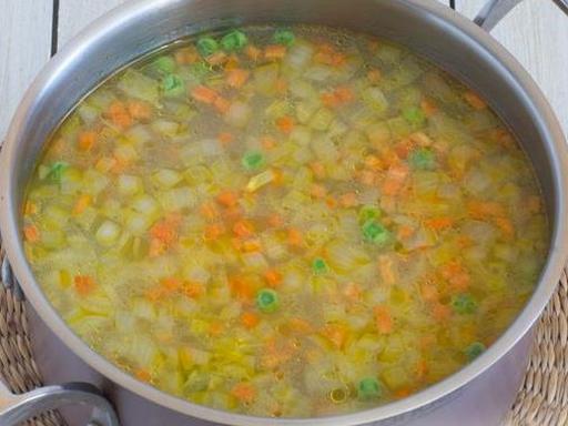 Добавьте обжаренные лук и морковь в кастрюлю к картофелю и рису. Промойте зелёный горошек, дайте воде стечь и также добавьте его в кастрюлю. Доведите содержимое кастрюли до кипения и варите на слабом огне в течение 5-7 минут.