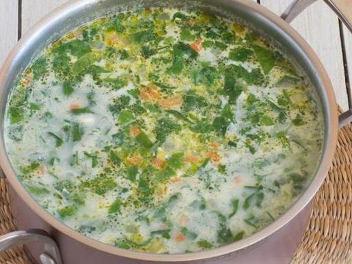 Добавьте в суп нарезанный шпинат и сливочный сыр. Всыпьте соль и чёрный молотый перец. Помешивая, доведите суп до кипения и варите на слабом огне в течение 5 минут, пока сыр полностью не растворится.