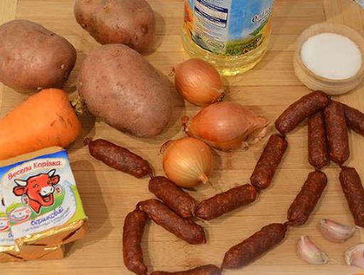 Підготуйте всі необхідні інгредієнти для сирного супу з ковбасками.