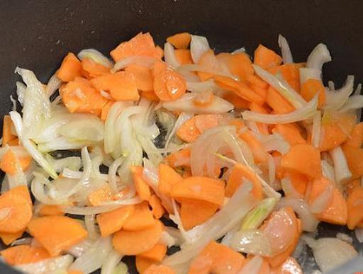 Очистіть і наріжте овочі. У казані або глибокій каструлі обсмажте подрібнений часник на олії протягом кількох секунд. Відразу ж додайте нарізані цибулю та моркву, обсмажуйте до прозорості. Додайте копчені ковбаски (або сосиски), нарізані кружальцями, і смажте ще 2 хвилини. Потім додайте нарізану кубиками картоплю і обсмажуйте, помішуючи, близько 10 хвилин. Посоліть за смаком.