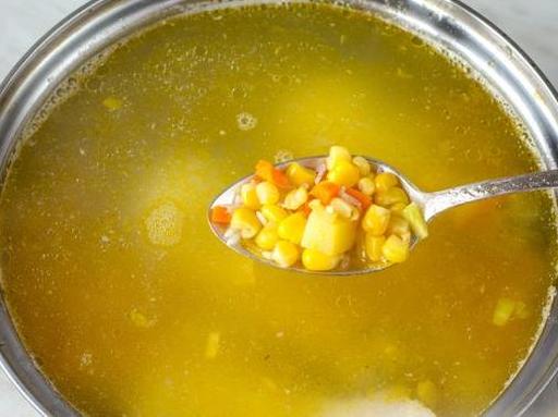 У каструлю з бульйоном відправте картоплю, рис, засмажку зі сковороди та кукурудзу. Варіть суп 10-15 хвилин.