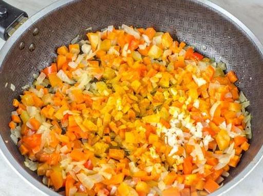 У сковороду з розігрітою олією викладіть цибулю, моркву та солодкий перець і обсмажуйте протягом 5-7 хвилин.